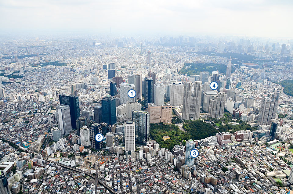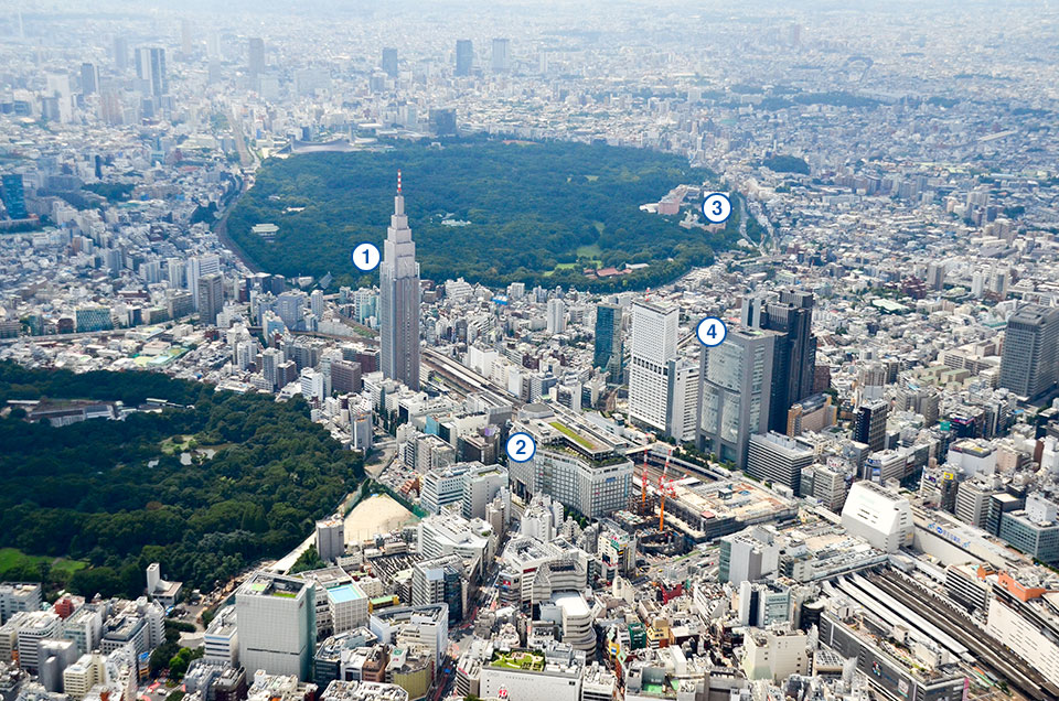 ①NTTドコモ代々木ビル ② 新宿タカシマヤ ③ 国立オリンピック記念青少年総合センター ④ JR東日本本社ビル