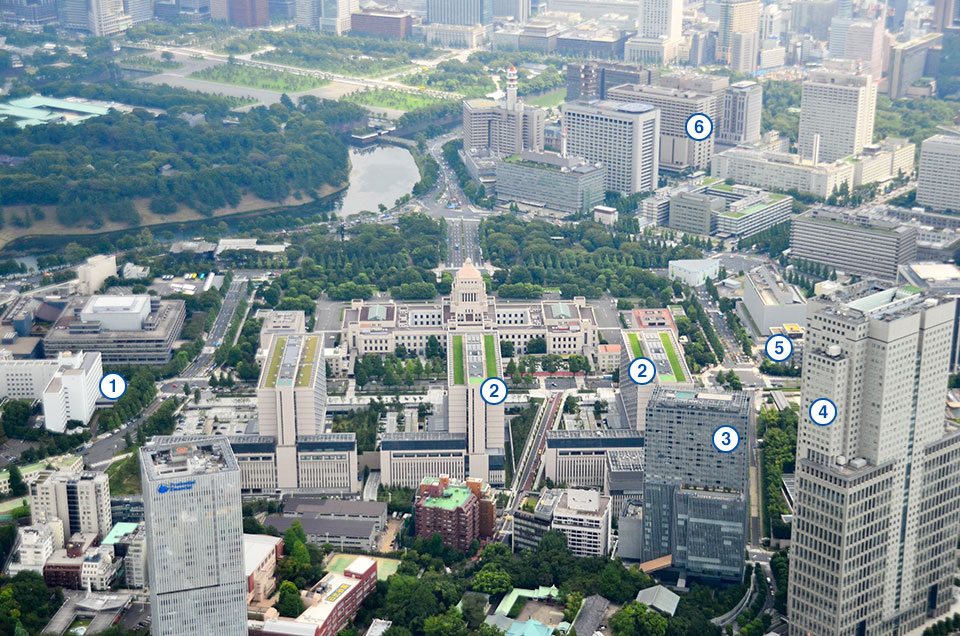 ①参議院議員第二別館 ② 衆議院議員会館 ③ ザ・キャピトルホテル東急 ④ 山王パークタワー ⑤ 内閣府 ⑥ 東京高等裁判所