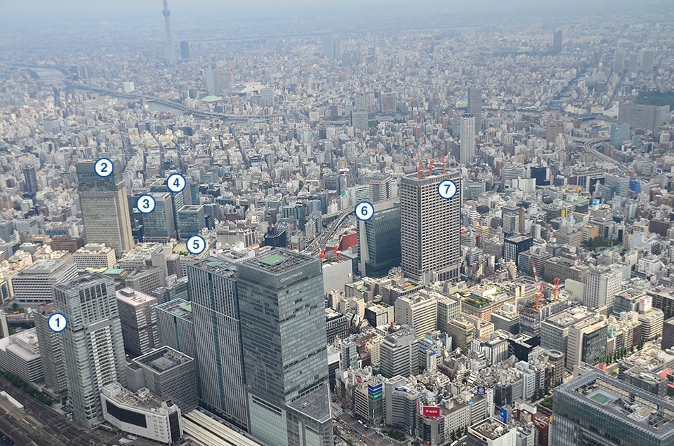 ①ホテルメトロポリタン丸の内 ② 日本橋三井タワー ③ COREDO室町 ④ COREDO室町2 ⑤ 日本橋三越本店