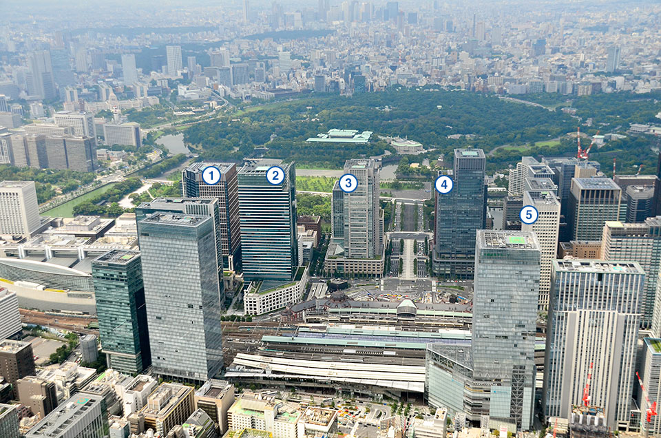 ①三菱一号館 ② KITTE ③ 丸ビル ④ 新丸の内ビルディング ⑤ OAZO
