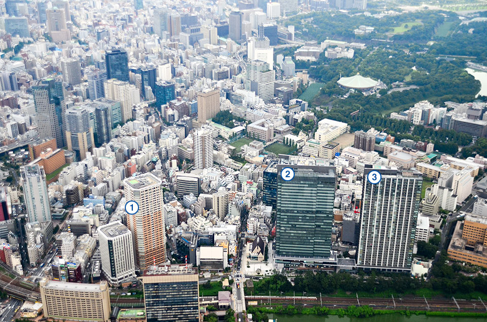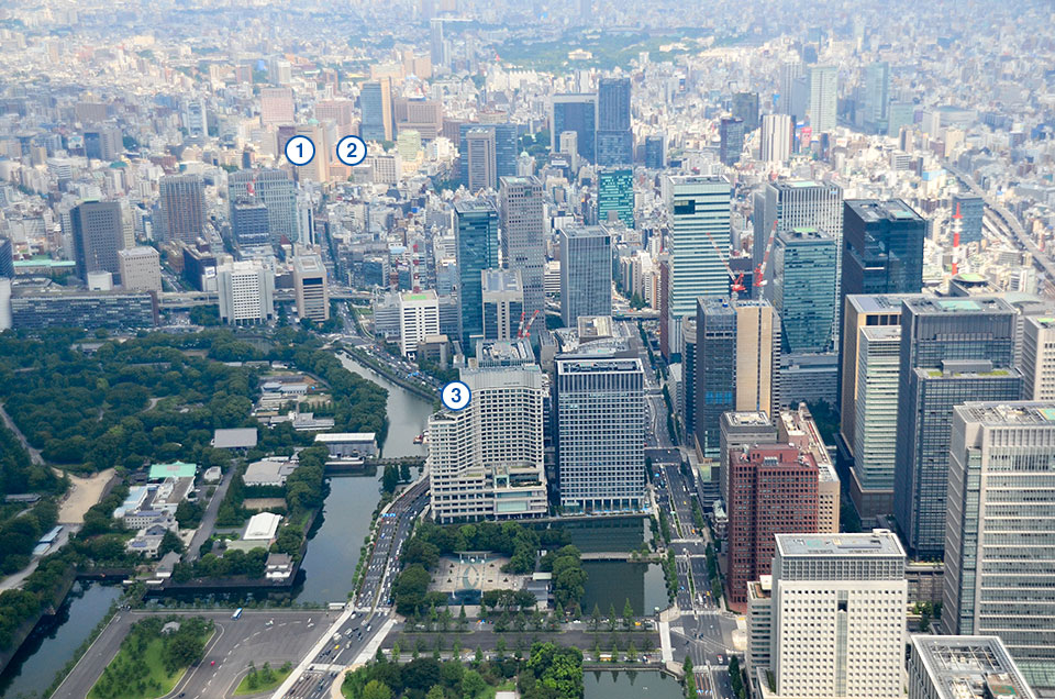 ①東京パークタワー ② 神保町三井ビル ③ パレスホテル東京