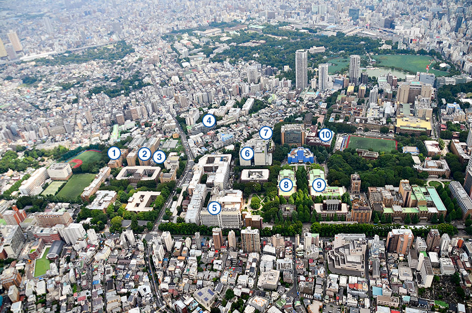 ①動物医療センター(旧家畜病院) ② 生命科学 総合研究棟 ③ 7号館 ④ 武田先端知ビル ⑤ 工学部壱号館