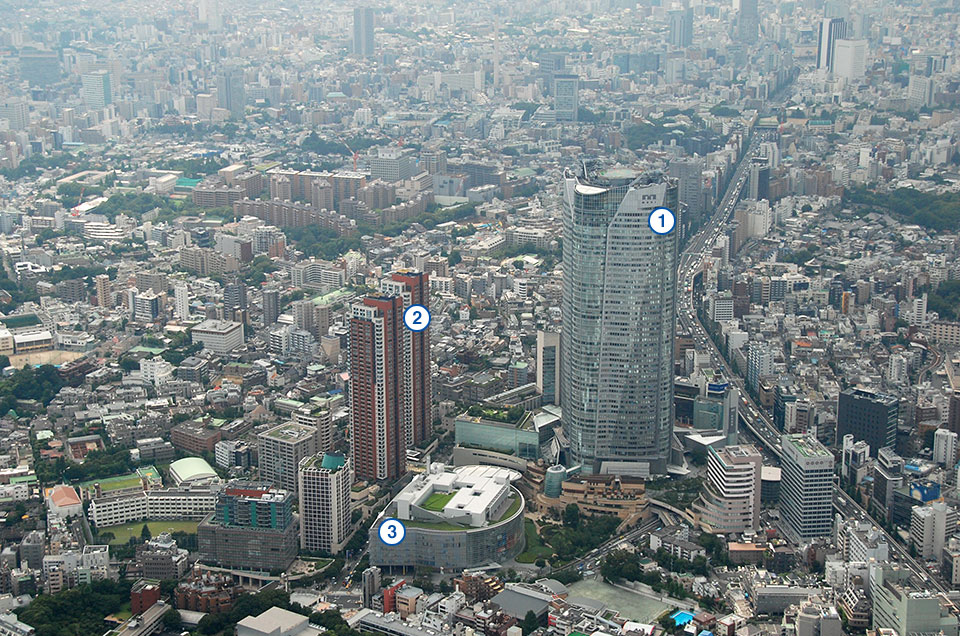 ①六本木ヒルズ森タワー ② 六本木ヒルズ レジデンスD棟 ③ テレビ朝日本社